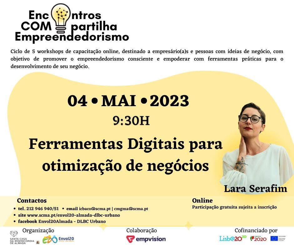 A primeira sessão, que tem como tema “Ferramentas digitais para otimizar os negócios”, conta com a colaboração de Lara Serafim, da empresa Empvision e será realizada no dia 4 de maio de 2023, às 9:30h, através da plataforma Zoom.