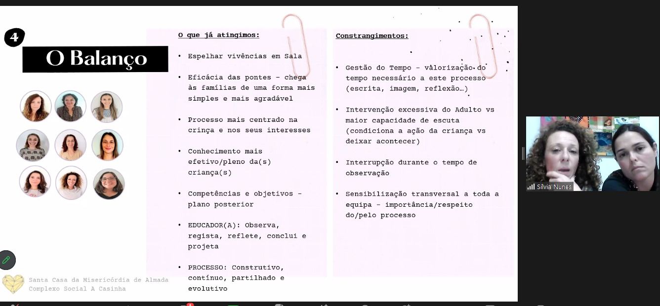 Sobre o tema narrativas e documentação pedagógica, demos a conhecer a nossa prática de observação, registo e reflexão, assente na escuta ativa dos processos de vida da criança, considerando-a no individual e no grupo.